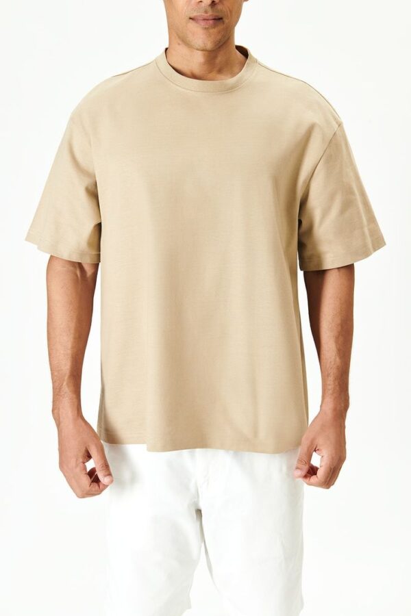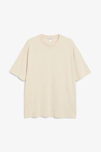 The neutral beige hue adds a touch of sophistication, making it an ideal piece for any occasion. Whether you’re lounging at home, running errands, or heading out for a relaxed day, this oversized t-shirt ensures you do it in style.